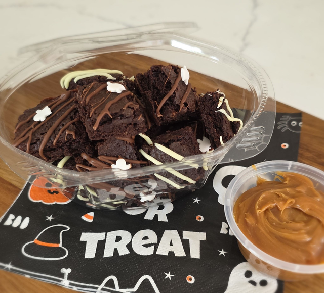 Our 150g tub of brownie bites are decorated with chocolate and ghost sprinkles, and come with a pot of caramel sauce for dipping.