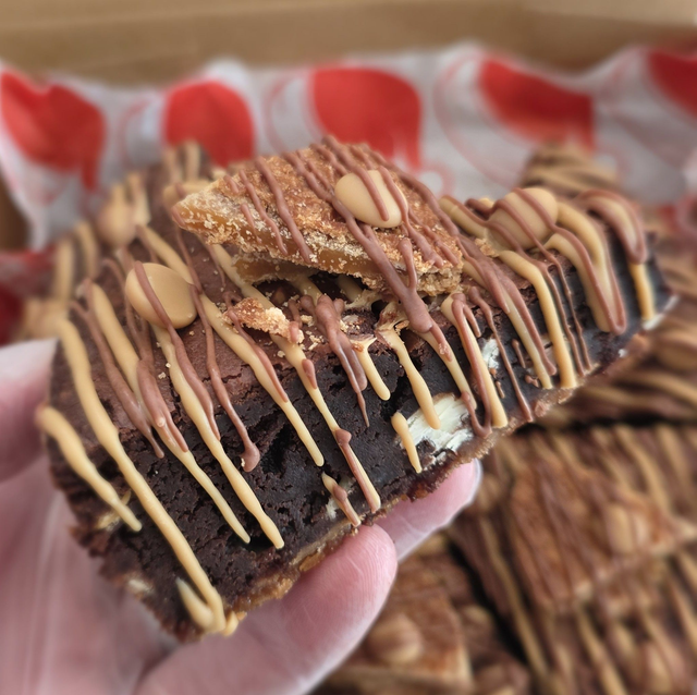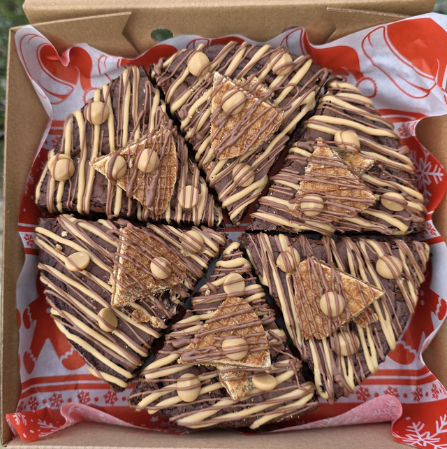 Think caramel, chocolate and sweet cinnamon all wrapped up into six slices of brownie! The chewy and crunchy stroopwaffel goes great with the soft fudgy brownie. Presented in our 7" pizza boxes with festive wrap.
