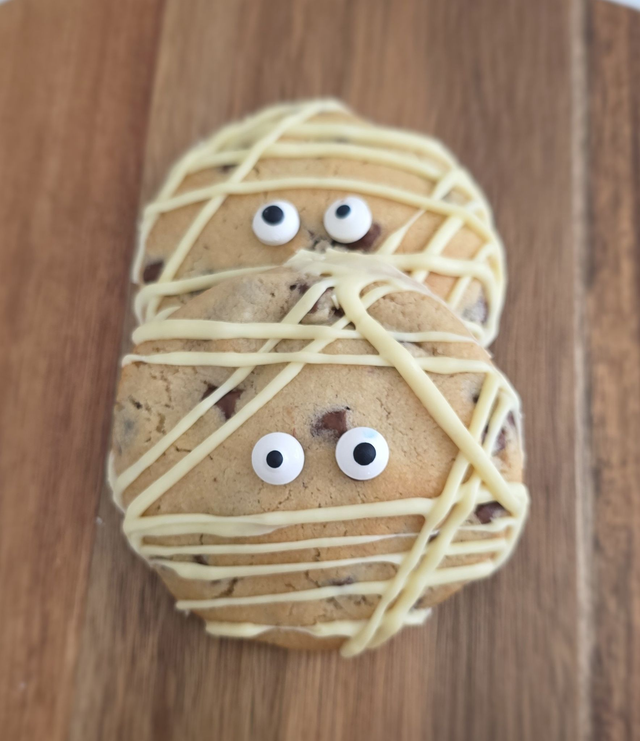 - Mummy choc chip cookie - our classic choc chip cookie, but with candy eyes and white chocolate mummy wrapping