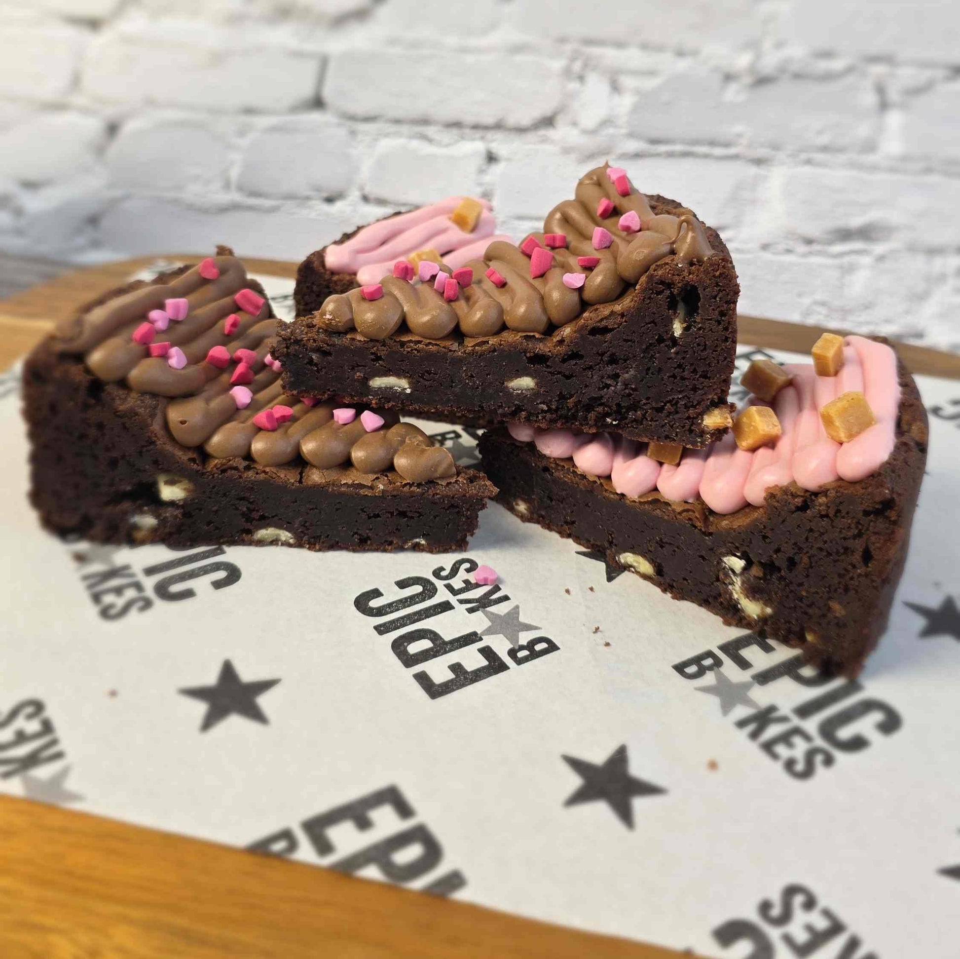 Valentine's Day special - A rich, fudgy 7" Belgian chocolate brownie with a generous topping of milk chocolate, heart sprinkles, pink white chocolate and fudge pieces. 100% full chocolate hit.